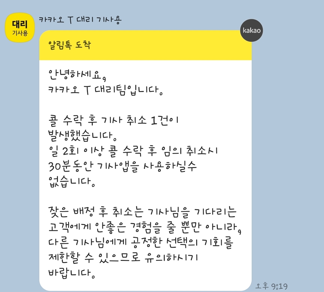배정취소를 하고 나면 카카오T대리에서 카톡이 오는데요. 하루에 2번이상 배정취소를 하면 30분동안 정지를 먹게 됩니다. 시간이 지나면 다시 대리 오더를 잡을수 있구요. 배정취소는 되도록이면 안하는것이 좋지만 상황에 따라 적절하게 사용하면 도움이 되구요.