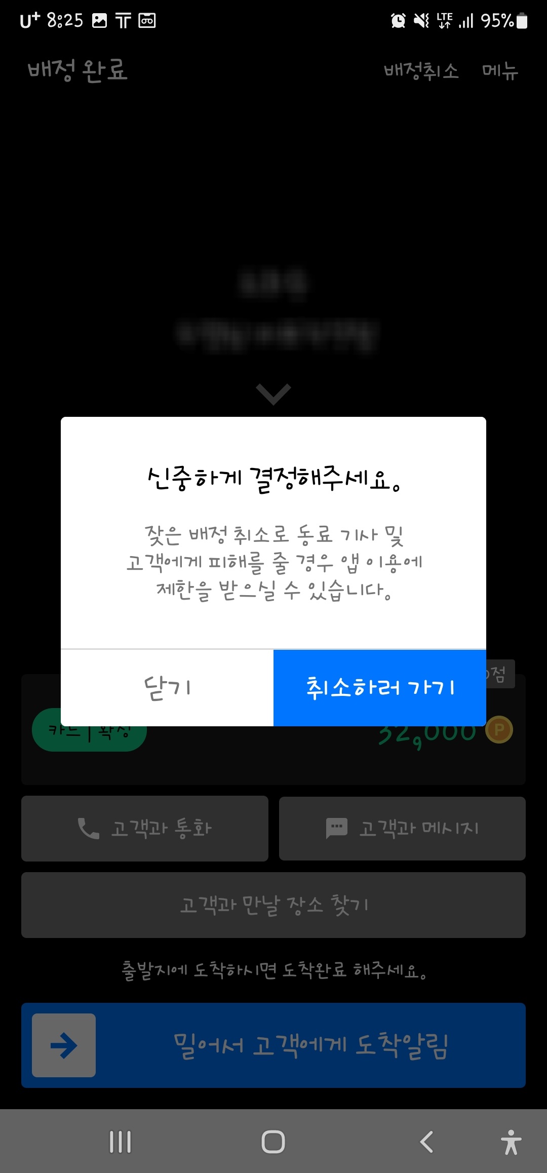 4.대리오더를 잡고 고객이랑 통화후 출발하는데 전화하면 가끔가다 반말하거나 화내는 고객들이 있어요. 그럴땐 정말 당황스러워요. 이런경우는 운행하고 싶지않죠. 기분 안좋은 상태에서 운행했다가 고객과 안좋은일이 생길수도 있구요. 저같은 경우는 바로 배정취소버튼을 눌러서 취소합니다.