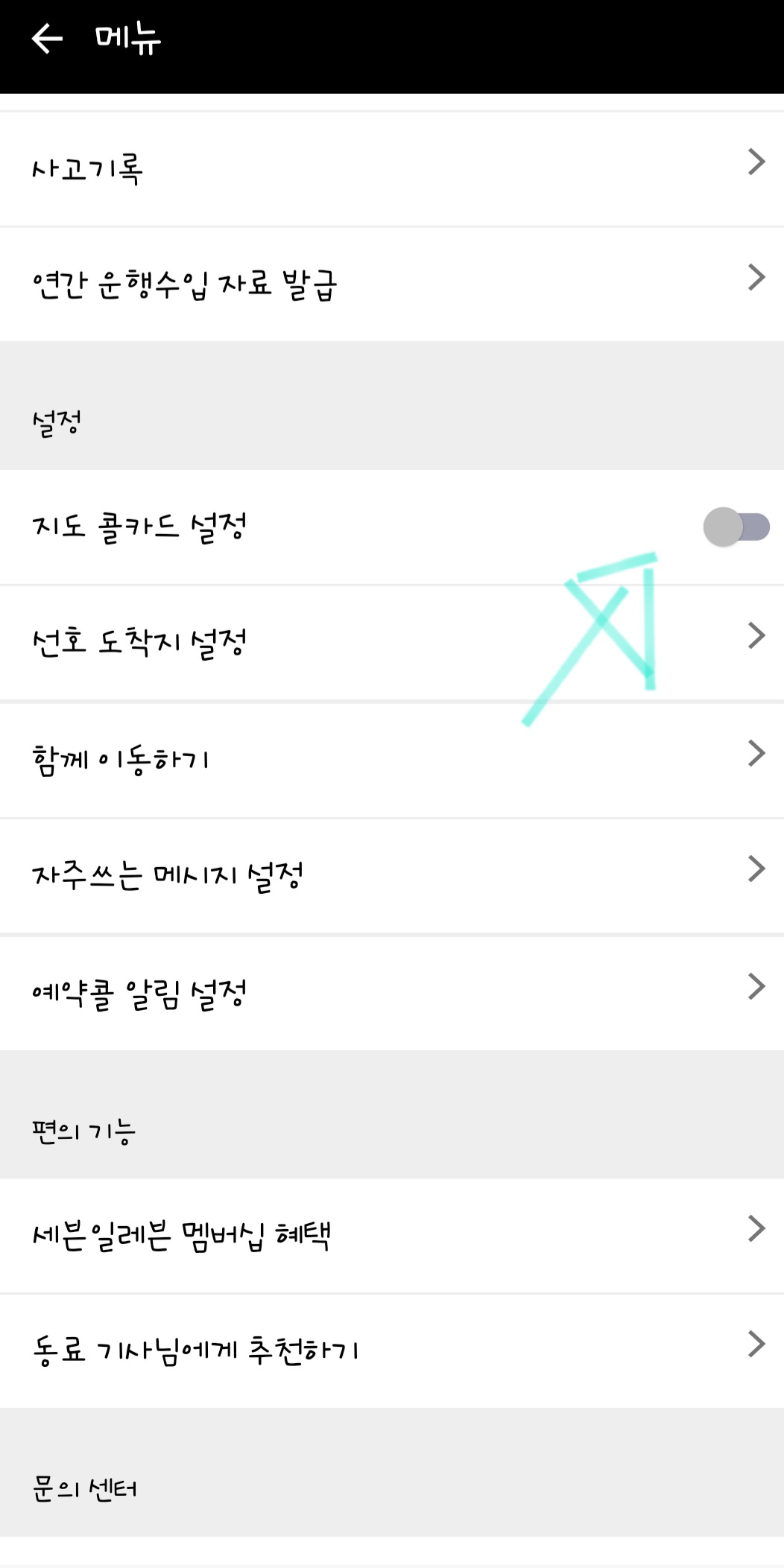 메뉴버튼을 누른 후 아래 쪽으로 보다보면 설정이 나옵니다. 설정에 보면 지도 콜카드 설정이 나옵니다.