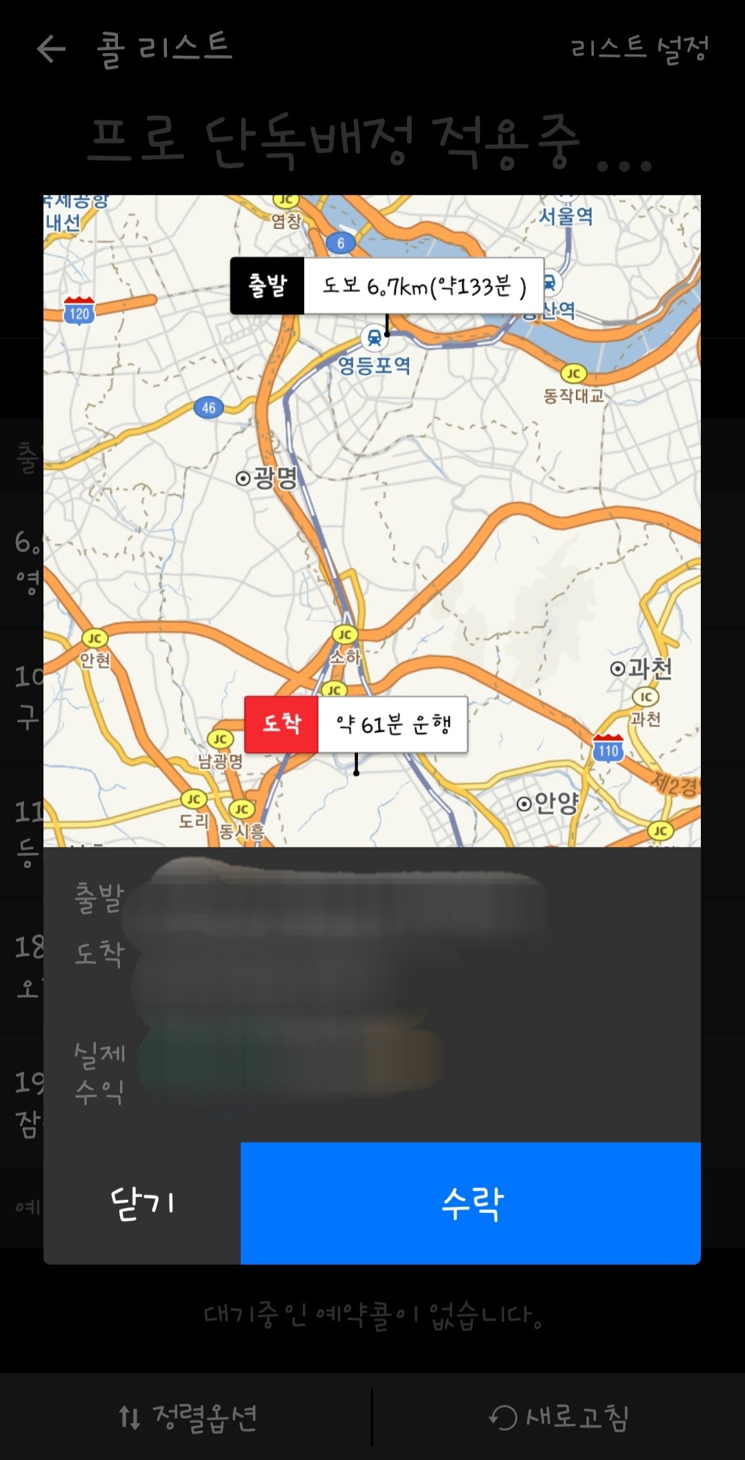 설정이 꺼져 있다면 위에 사진처럼 콜을 눌렀을때 고객이 있는곳까지의 거리와 도착지 주소.운행시간 및 수수료제외하고 대리기사가 직접 받을 금액만 나오게 됩니다.