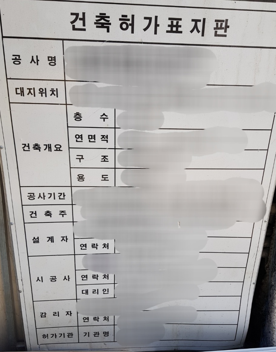 건축허가표지판에는 현장관계자 연락처가 적혀있습니다. 그리고 가끔 어떤곳은 건축주 연락처도 같이 적혀있는곳이 있어요.